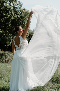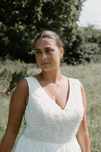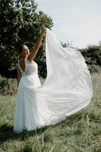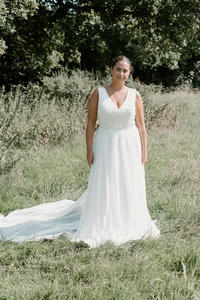With a luxury chiffon train and sweeping v-neck line she is sure to make an impact on your big day.