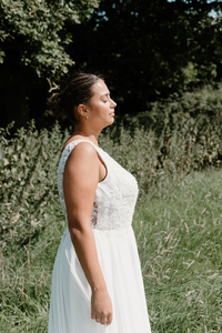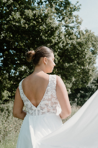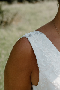 She has a romantic low illusion back covered with sparkling lace appliques. Ideal for a destination wedding.