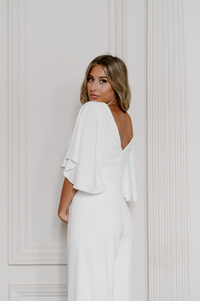 Chicago! This stunning, ivory crepe jumpsuit features a deep V-neck, Waterfall sleeves and belt. Complimenting the whole look. This is a timeless design, showcasing an alternative edge.