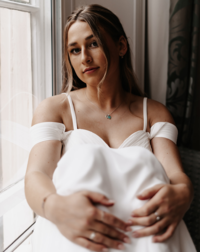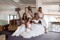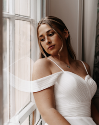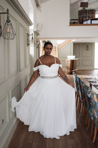 With off the shoulder details to adore and ruching that creates the ultimate silhouette, smoothing over your curves while offering comfort and movement. She is just the dress you need for your wedding day.