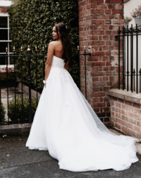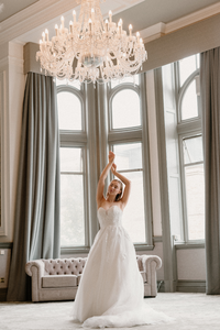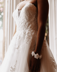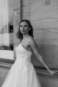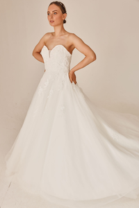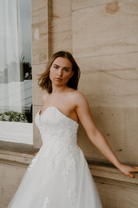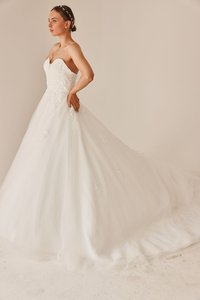 She is a strapless gown, with the bodice covered in lace appliques that gently flow onto the princess skirt.