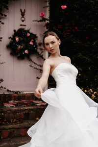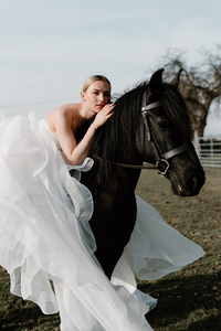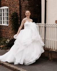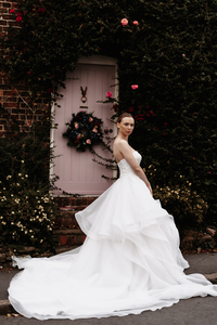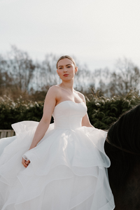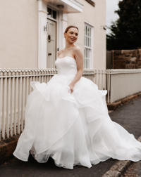Palma's luxury sweeping organza skirt and satin bodice gives her bride the desired glamour. She will wow you from all angles.