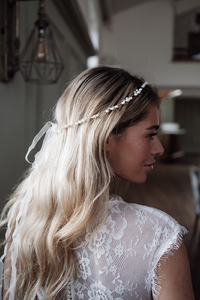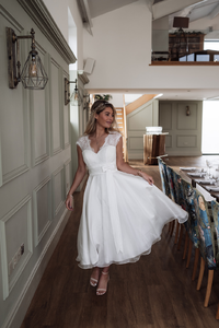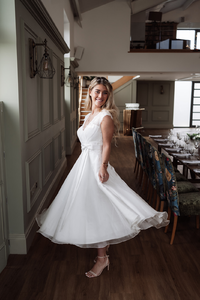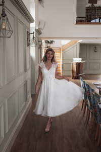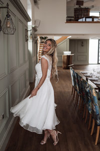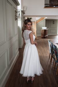 The party starts in the back with the high lace panel which flows into the playful organza skirt.