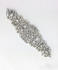 Smaller sized silver, diamanté and pearl belt. A stunning addition to any bridal gown. Please note there are no traces of nickel in any of our products. Measurements: 17.5cm x 5cm