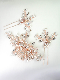 Stunning diamante comb and pin combination available in silver and rose. Our accessories are not made with any materials containing nickel however there may be traces so please be cautious.