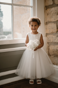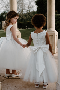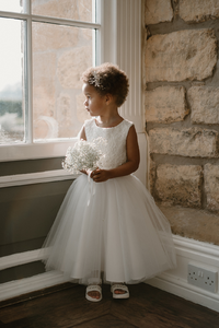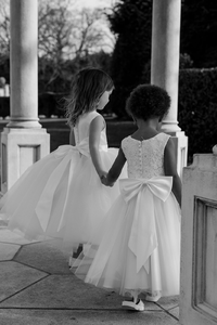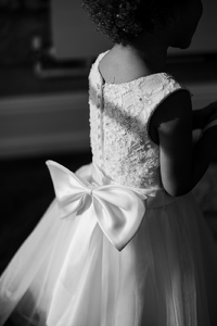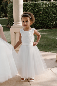 The FG004 designed with love for flower girls who love to twirl, our adorable FG004 is picture-perfect in every way. Made with a delicate soft tulle skirt, a gentle asymmetric hemline and finished with a beaded bodice. We know your little princess will love it just as much as you do.