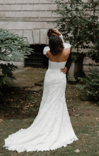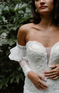 Designed to captivate...Samara. This gorgeous fitted gown features a daring plunge neckline, adding a touch of modern allure to it’s timeless silhouette. The gown’s mesh, off-the-shoulder puff sleeves gracefully drape along the arms for a dramatic yet refined look. Every inch of Samara sparkles with intricate beadwork, reflecting light with every movement, creating a look that is both bold and romantic. Ideal for the bride who seeks sophistication with a touch of daring flair.