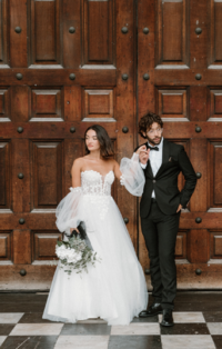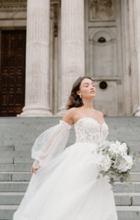She is feminine. She is grace. She is romance. She is Solane. Solane is a dreamy and romantic gown adorned with delicate floral appliques that add a soft whimsical charm. The bodice is embellished with intricate flowers that flow on to the light and airy skirt, creating a look that is both elegant and ethereal. The gown is complimented by matching puffy sleeves, giving it a touch of vintage-inspired flair while maintaining a modern edge.