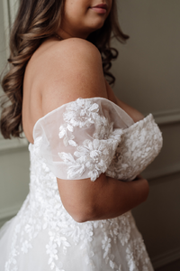 Delicate tulle and sequin applique cap sleeves that match style WD025. These are a perfect up-sell for any of our gowns but are designed to compliment the WD025 perfectly. One size only, price is for one pair.