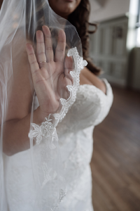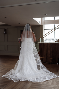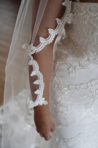 Full length single tier veil with scalloped lace applique