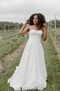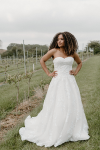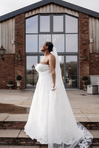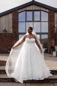 Although this gown comes strapless and with a simple but flattering sweetheart neckline, we also sell a full range of accessories to help you customise the style and create an entirely new look for your bride. This includes straps, sleeves and veils, all designed with the same glittering appliques to create a seamless look.