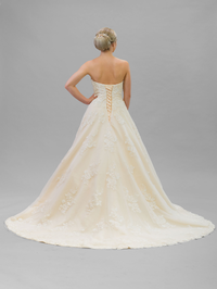 This gorgeous princess gown is decorated all over with glittering appliques, collecting at the fitted bodice and corset back.