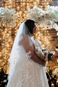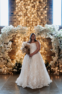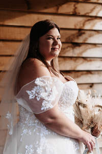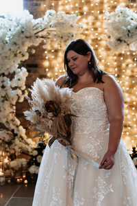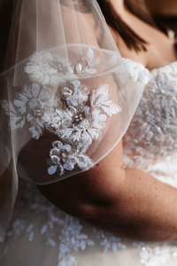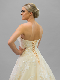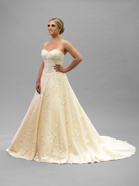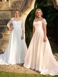 Although this gown comes strapless and with a simple but flattering sweetheart neckline, we also sell a full range of accessories to help you customise the style and create an entirely new look for your bride. This includes straps, sleeves and veils, all designed with the same glittering appliques to create a seamless look.