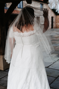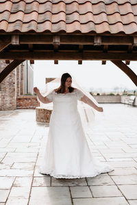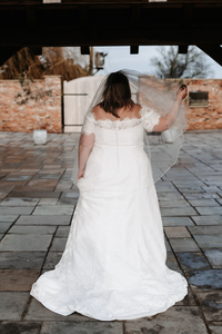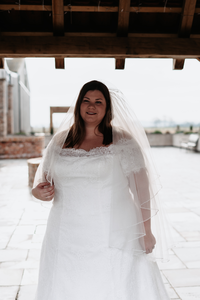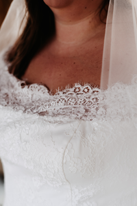 This bardot gown is a striking and modern take on the traditional all-over lace look.