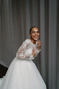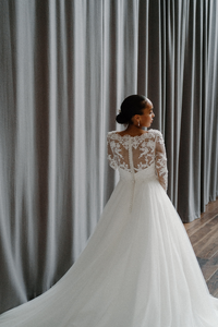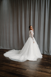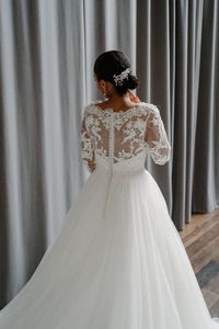 This princess gown's huge selling point is her beautiful full lace sleeves.
