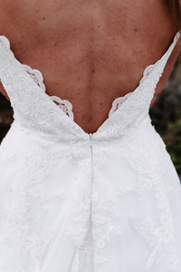 The elegant low back with scalloped lace detailing mirrors the stunning detailing at the hem, creating a beautiful silhouette on the aisle.