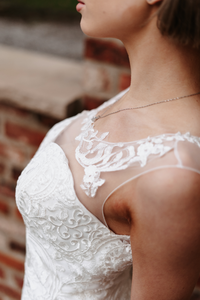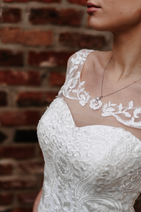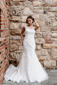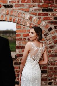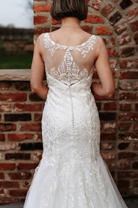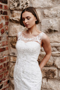 Delicate ivory fishtail gown, with stunning lace pattern. This gown has a stunning illusion neckline and back detail. Zip and button finish only available in blush.