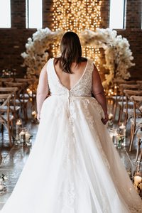Finished with a slight plunging neckline and delicate beading at the bust, the cut on this gown accents any figure perfectly - either creating curves or beautifully flattering them.