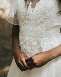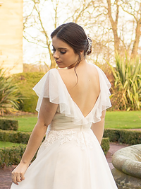 The sleeves on this gown lead into a simple yet beautiful ruffle back detail, complimenting the lower V-back.
