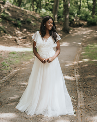 The delicate, floating sleeves are perfect for a bride who wants a little more coverage up top, and are balanced with a flattering V-neck at the bust.