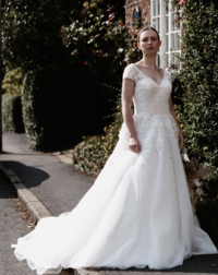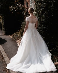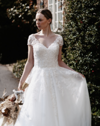 The summer lace continues over the brides shoulders into a gentle cap sleeve offering a little more coverage.