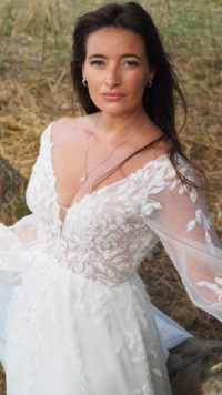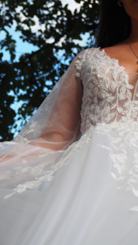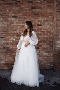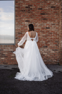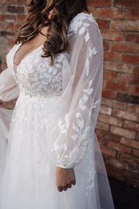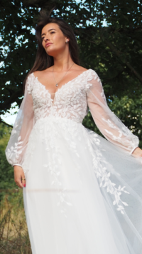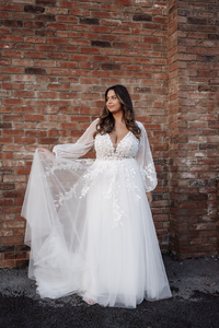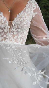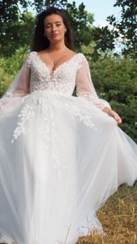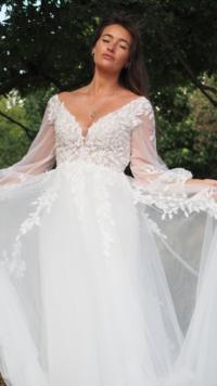 Sheer long sleeves with beautiful lace appliqués and a skirt of layered soft tulle complete this feminine look.