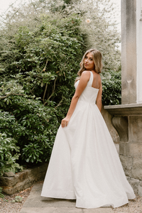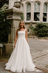 She captures the light aswel as everyone's attention. The WD158 is the perfect gown for all glamourous brides. The square neckline is an enduring statement aesthetic of this design. Flowing in to a voluminous skirt, that hangs delicately with a sculptured horsehair hem.