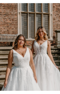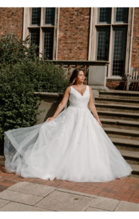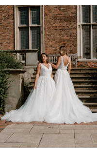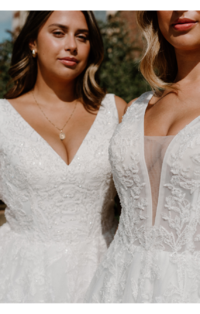 True feminine elegance. Her beautiful deep illusion v neckline with plunge detail is covered in lace applique detail and an illusion bodice to ensure she captures attention in her beauty. the Layers of soft floaty tulle flowing from the waistline of this timeless A-line wedding dress silhouette is just dreamy.