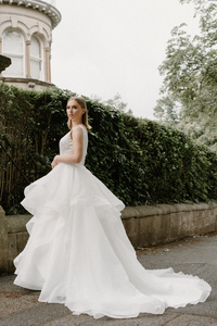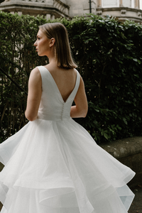 A satin classic and sophisticated top meets a flouced, ruffled organza skirt. Fun and romantic and enchanting the WD161 is waiting. Create the perfect mini me look with matching flower girl FG005