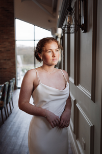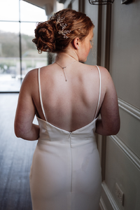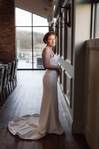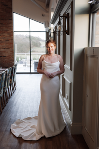 We love the cowl front on the WD163. A clean and modern gown made with luxurious crepe which lovingly highlights the natural curves. The spaghetti straps allows extra support, whilst adding to a soft and elegant finish.