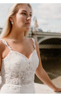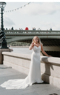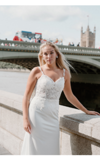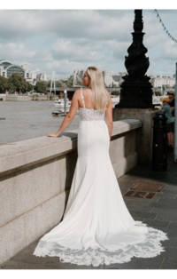 Sparkle and crepe the perfect balance! Hello WD172! The beautifully intricate bodice of the dress shimmers as the crepe fabric flows gracefully, creating an elegant silhouette that moves effortlessly with each step. The delicate lace detailing on the straps adds a touch of timeless romance, while the subtle sparkle of embedded beads catch the light.